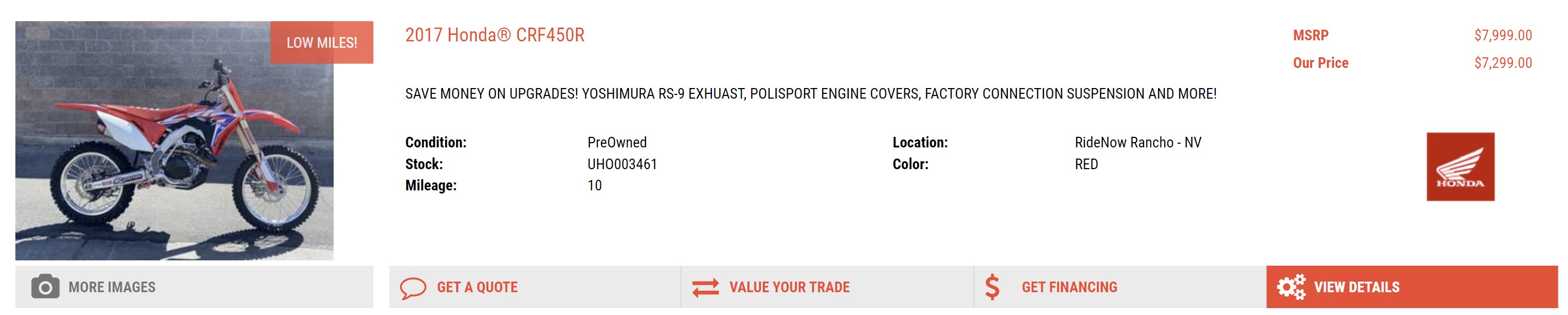 RideNow Vegas is proud partner with TwoFour Speed to #SupportLocalMoto.Through track sponsorships, support programs, rider offers and track day events we look forward to supporting and growing the Vegas Valleys motocross & offroad community. Below you will find the latest offers available from our RideNow Rancho and RideNow Boulder locations. Stop in and grab these offers before they are gone. Want to know when the latest specials drop? Sign up for our newsletter here.Subject to inventory availability. Contact dealer for current inventory levels and to put a deposit on yours.