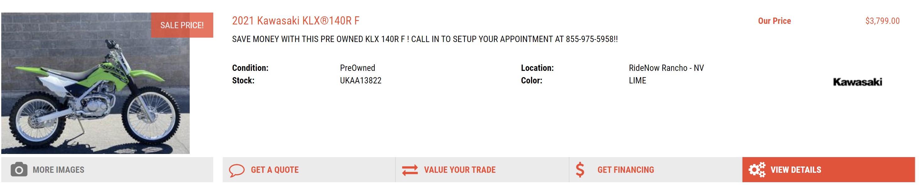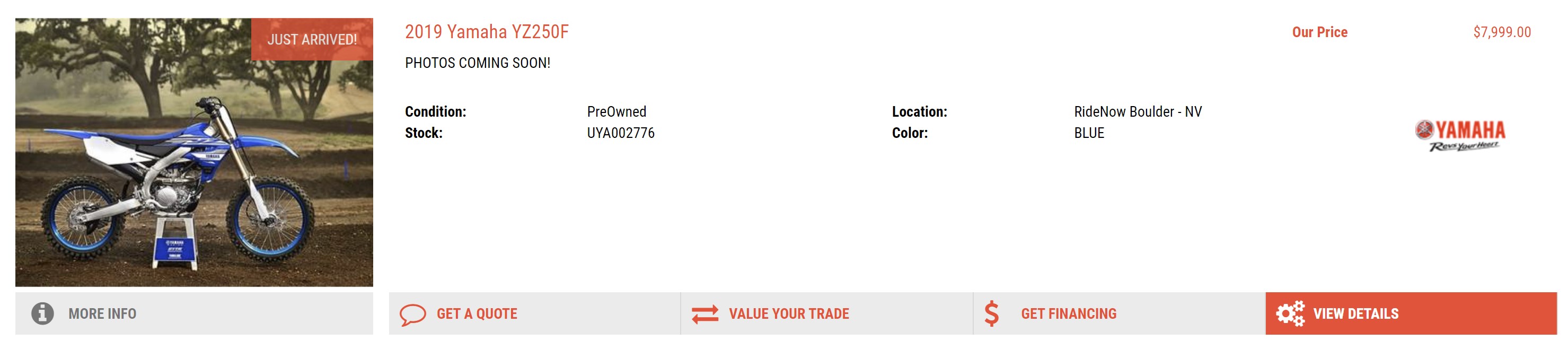 We stock pre-owned Off-Road! Check out a few of our current inventory below or click them to visit our full inventory. You are sure to find the perfect motorcycle or ATV for everyone!